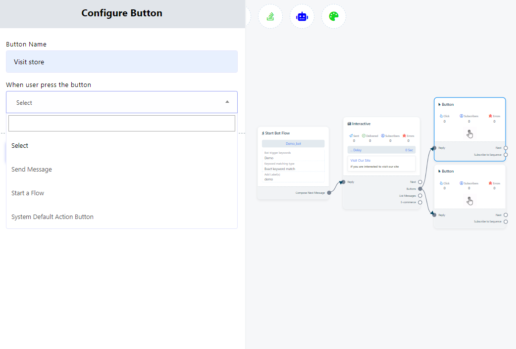 - Click on the drop down menu of `when user press button` and select what action you want to take.